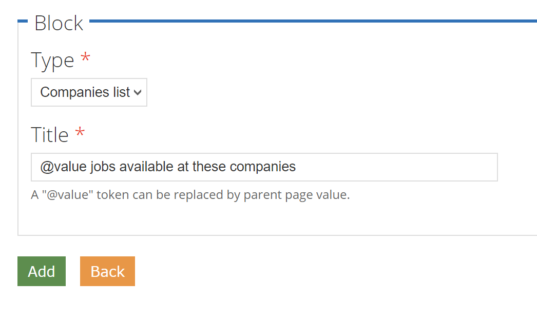 To add a sub-page term block, click on “+Add sub-page block”. Select the term from the list and add the Title, here you can again use the “@value” token.