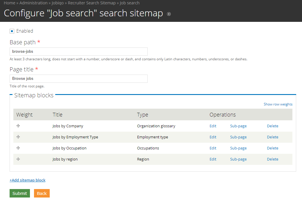 Add the base path. This is the URL under which the search sitemap will be found. In this example the path would be www.jobboardname.com/browse-jobs.
